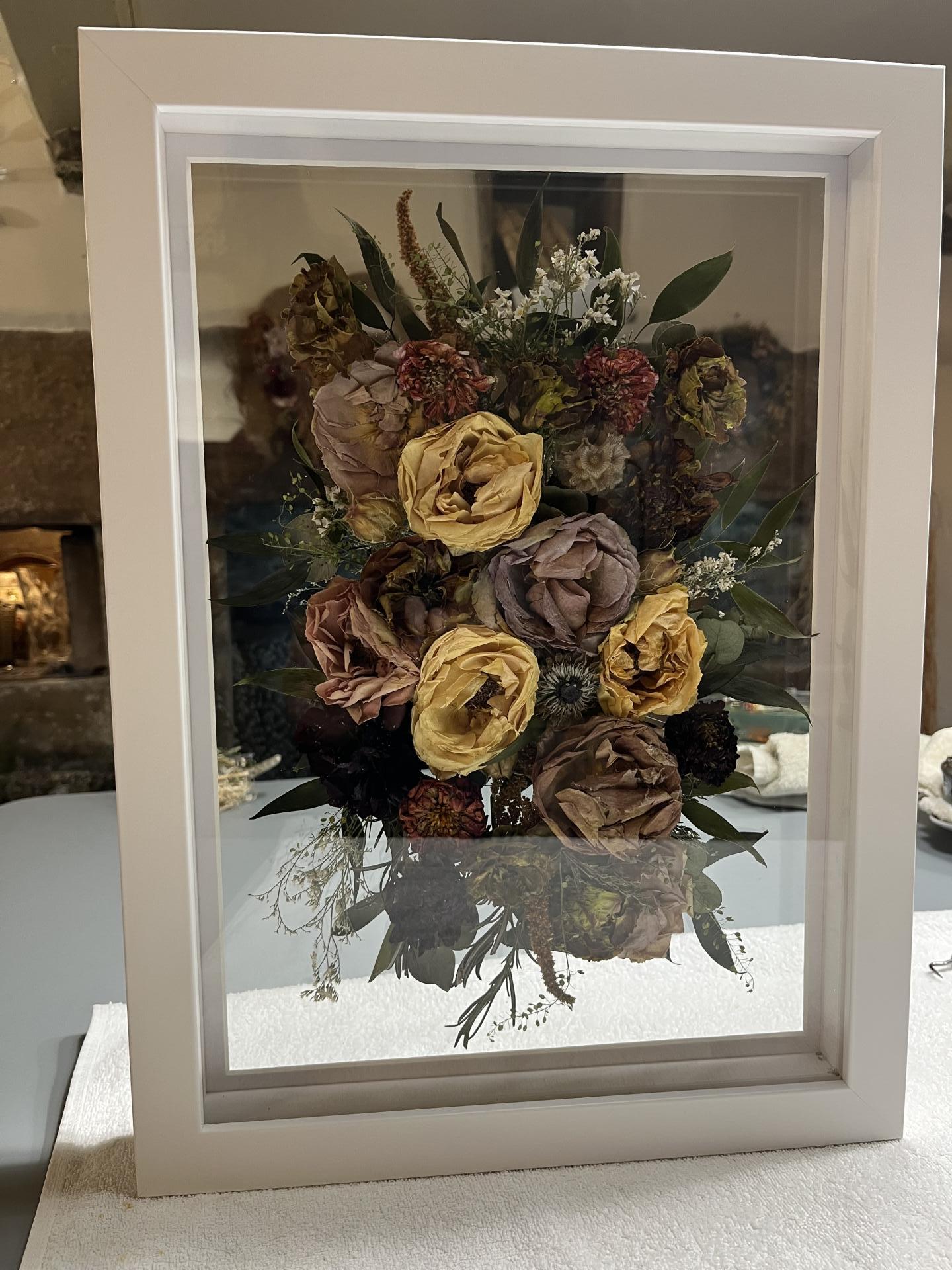 I have had the best possible experience dealing with Sally.One of our daughters got married in September and our other daughter was a bridesmaid. I wanted to have their bridal bouquets made into dried floral art in floating frames. Peter at the Frame shop in Skipton made bespoke frames for me and Sally painstakingly preserved the flowers and then created stunning displays with them. I picked up the two incredible pieces today. They are absolutely amazing. Soon my daughters will have the most beautiful gifts to hang on their walls and have something to treasure from the beautiful wedding. I could not recommend Sally more highly or thank her enough for what she has done. I will be a regular customer from now on. Thank you again Sally.